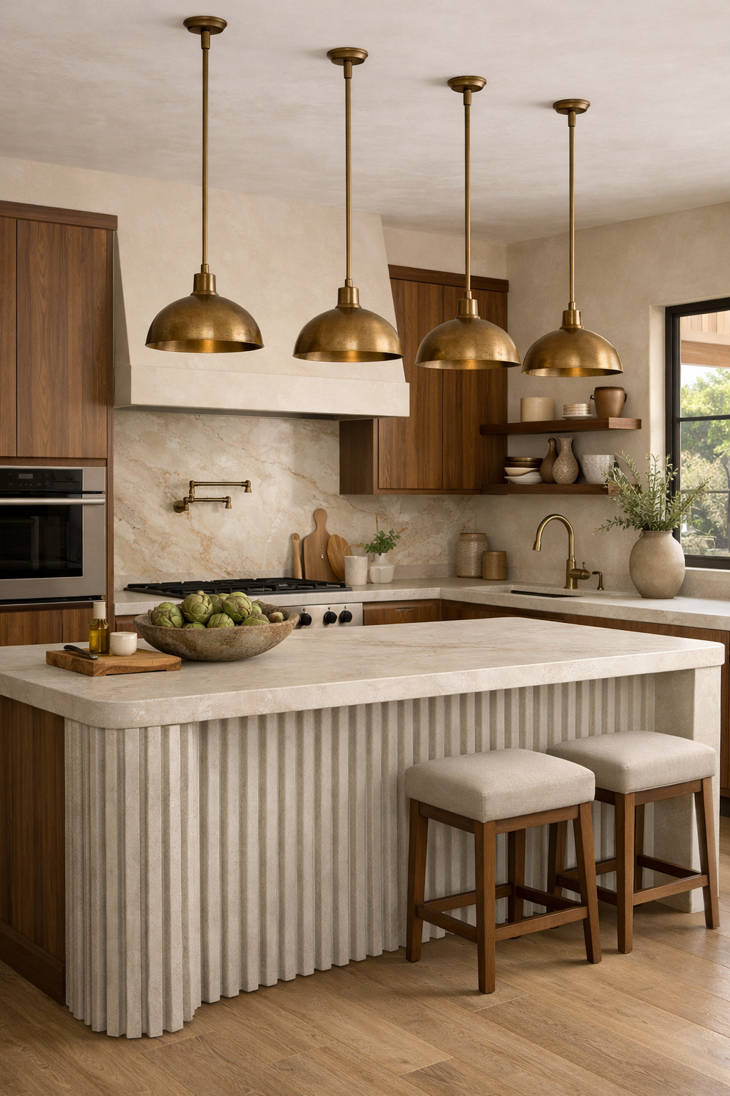 The use of warm beige tones creates a serene, monochromatic foundation that allows architectural details to shine. In this design, the fluted stone island serves as the primary focal point. The vertical grooves of the fluting create a rhythmic play of light and shadow, adding depth without the need for complex patterns.