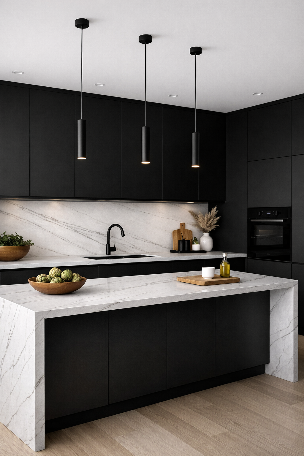 For a truly modern take on the farmhouse kitchen, matte black cabinetry offers a bold and uncompromising aesthetic. When paired with White Macaubas quartzite, the result is a high-contrast space that feels incredibly sharp and precise.