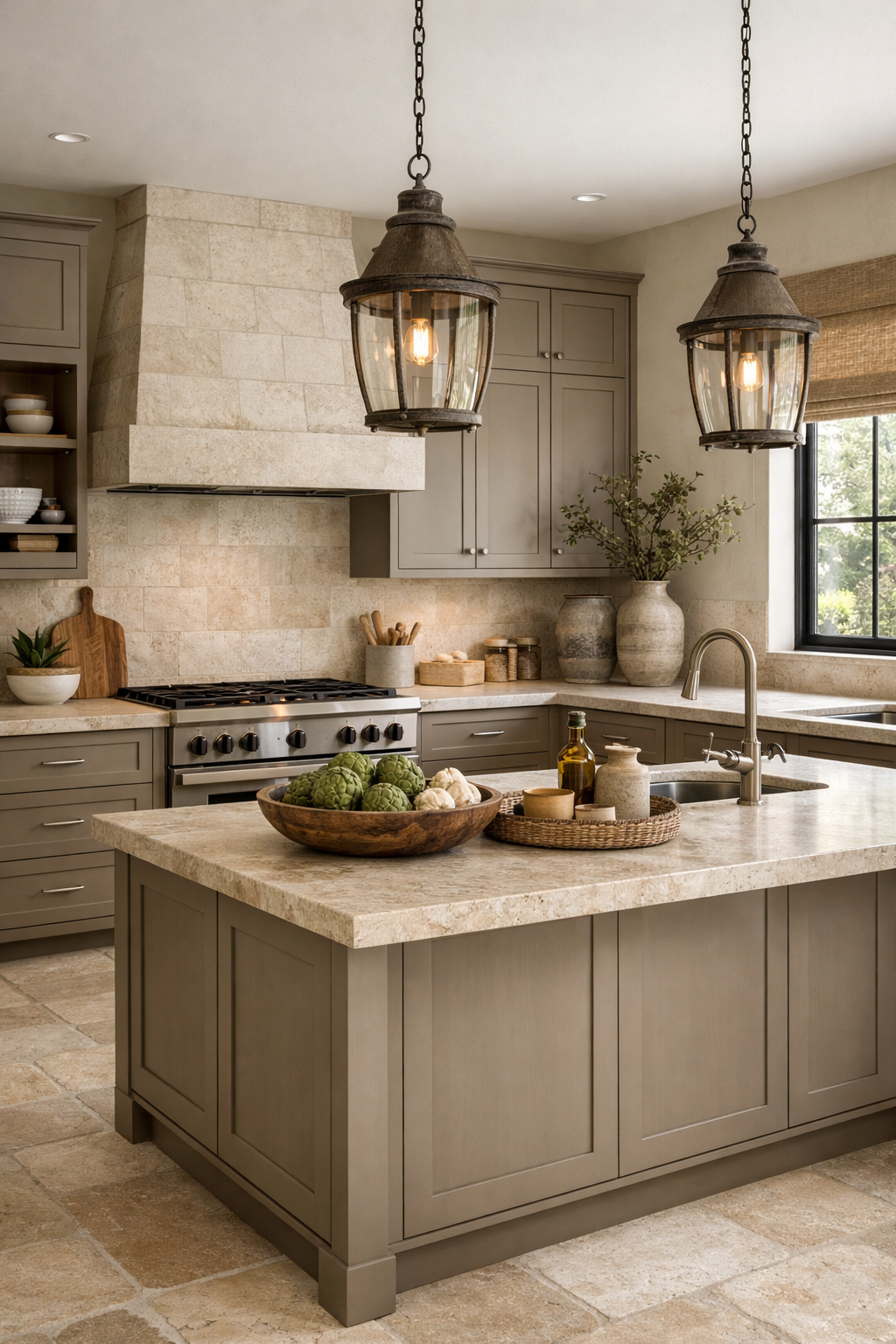 This design is all about texture and tone. The subtle variations in the taupe cabinetry and the limestone surfaces create a rich, layered effect that feels both cozy and refined.