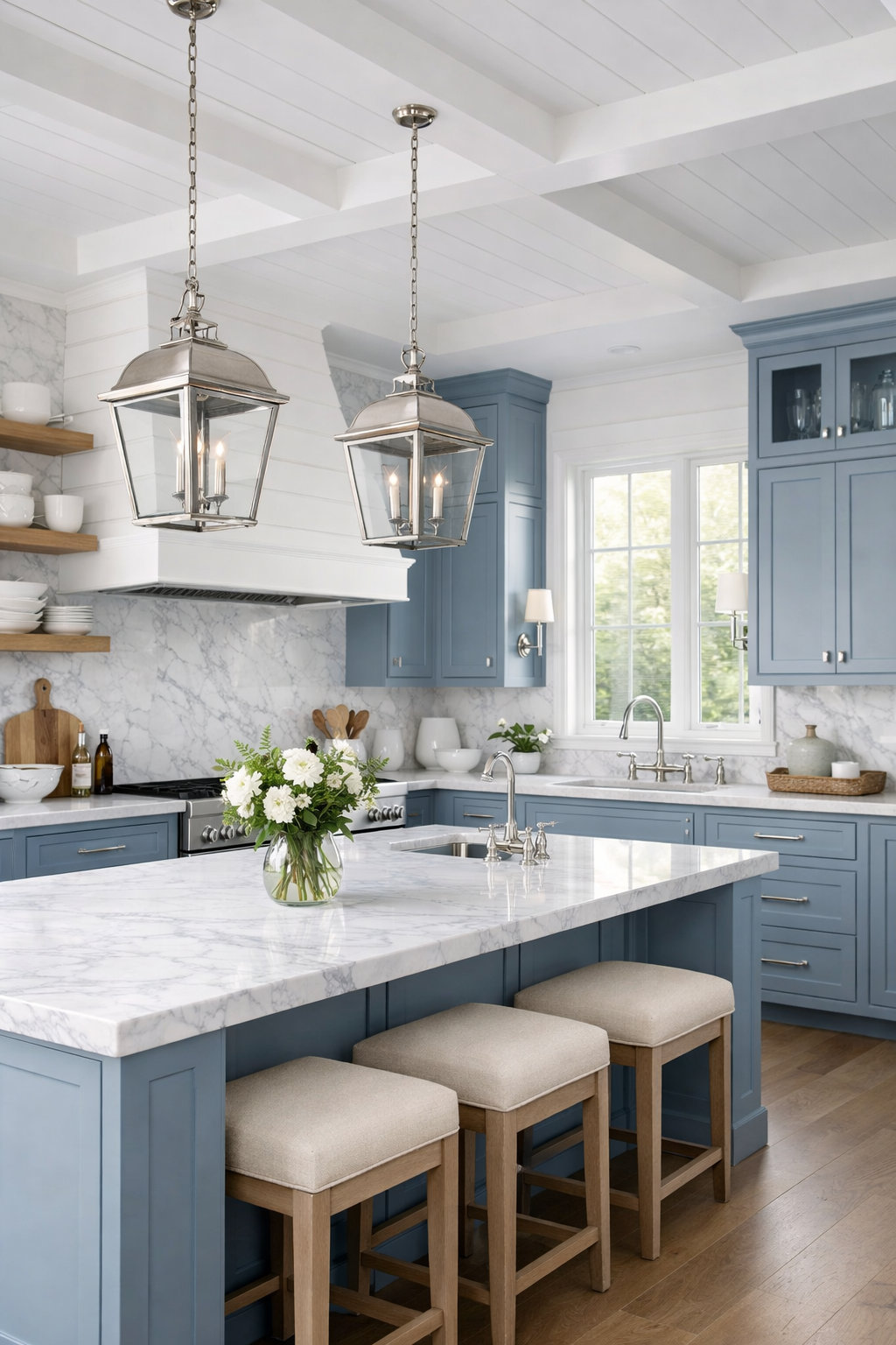The soft grey veining of the Carrara marble complements the cool tones of the blue cabinetry, while polished nickel accents add a touch of sparkle and light. This combination is perfect for creating a bright, open space that feels connected to the sky and the sea.