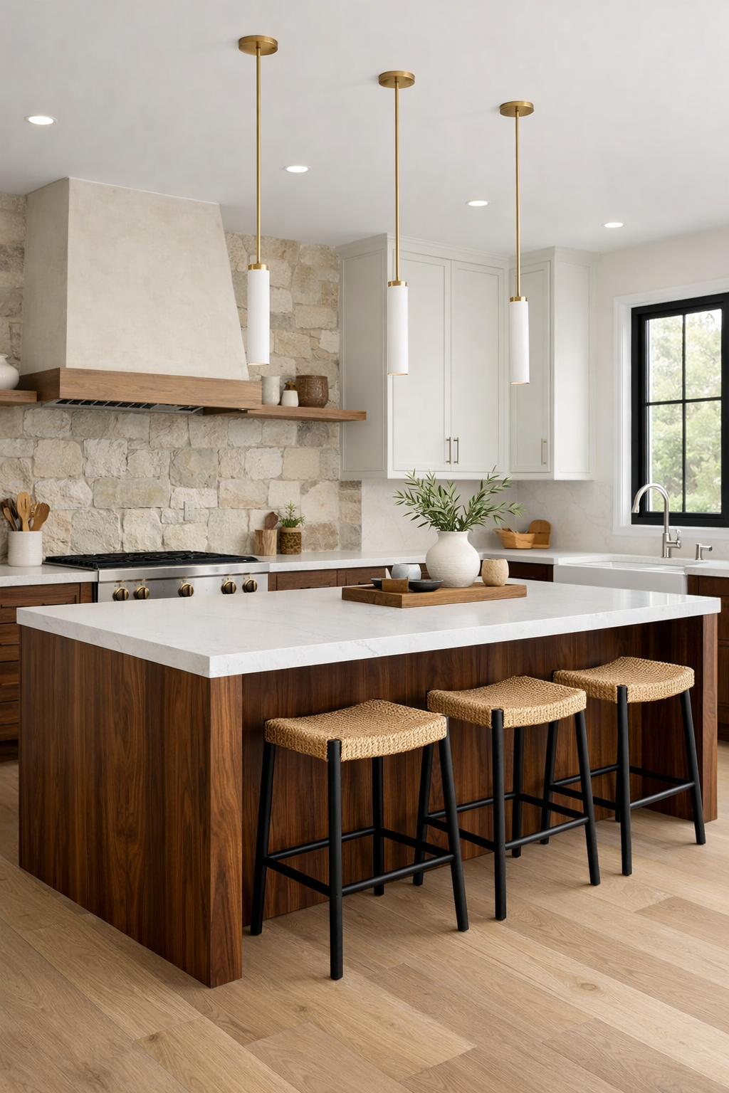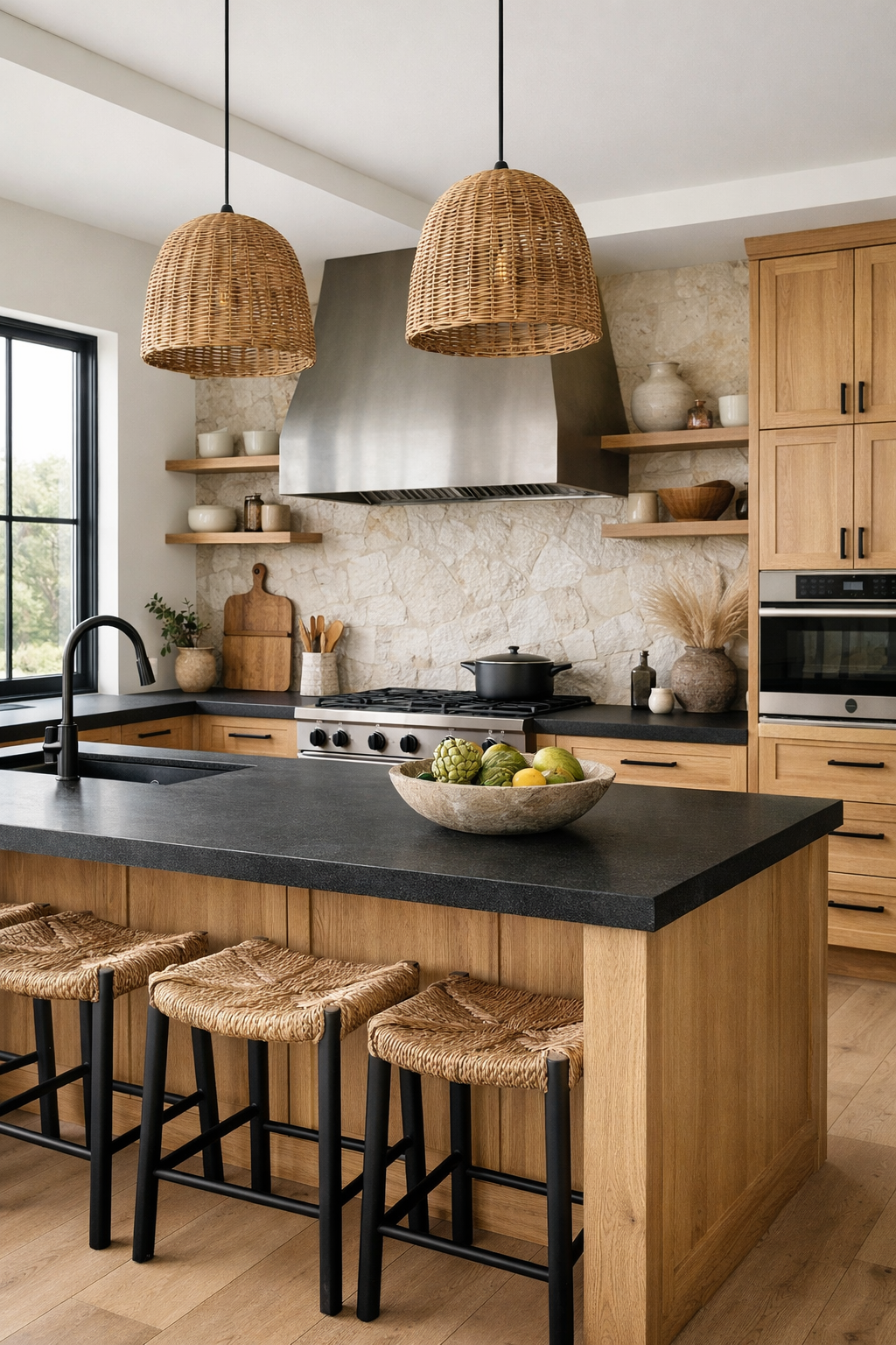 The clean, linear execution of the cabinetry and the island ensures that the space feels organized and efficient, while the natural materials provide a sense of warmth and soul.