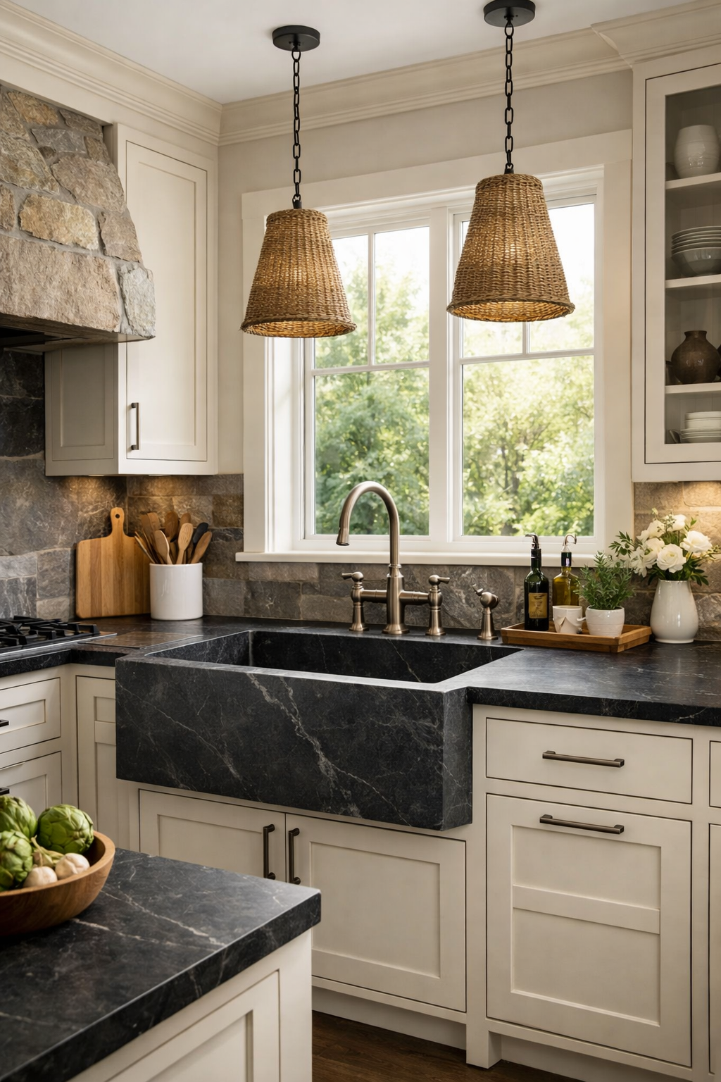 The dark, matte soapstone provides a powerful visual anchor in the sea of creamy white cabinetry. This contrast highlights the functional heart of the kitchen, turning a simple sink into a piece of architectural sculpture.