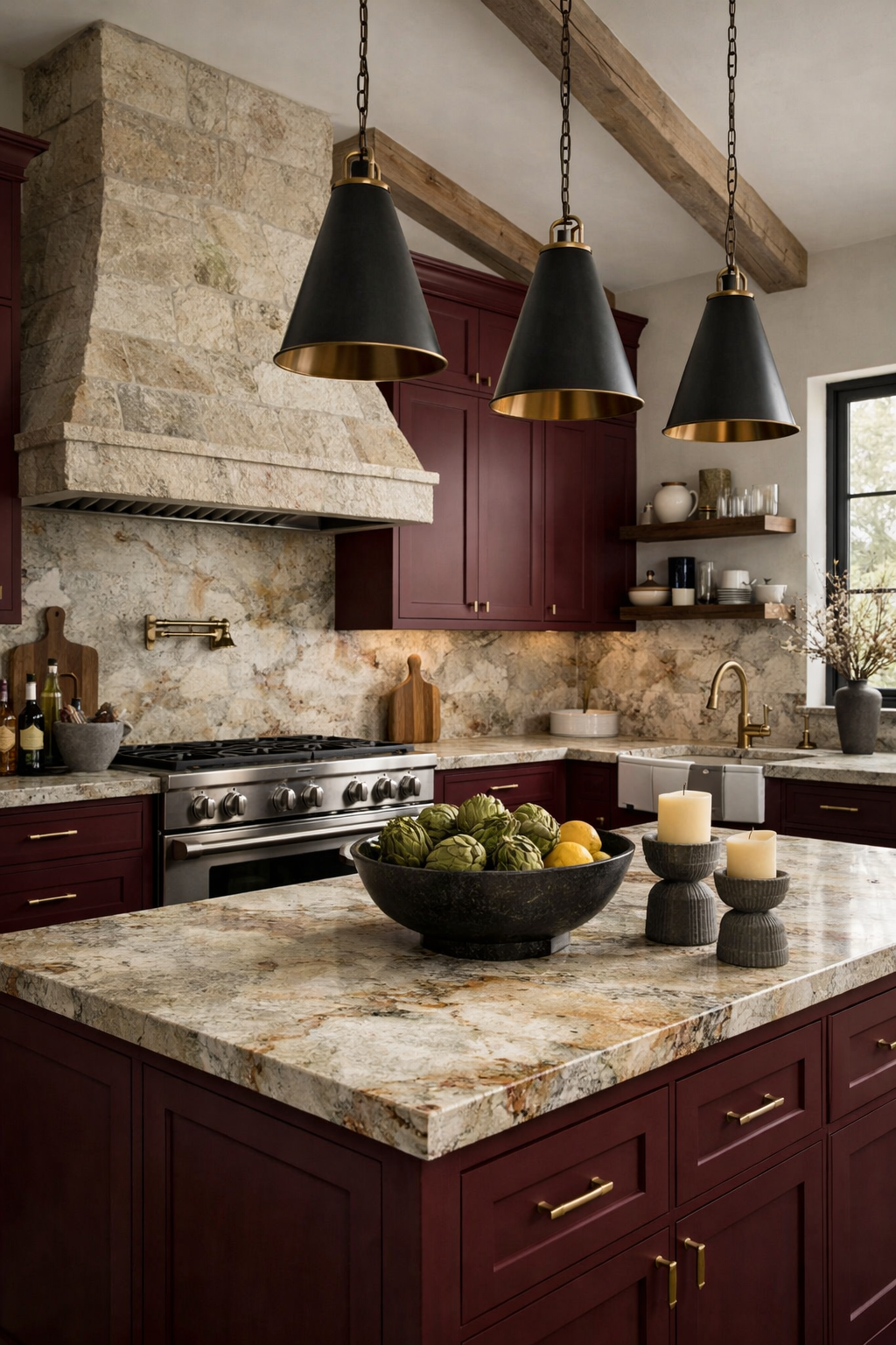 Rich burgundy is a bold and sophisticated color choice that brings a sense of drama and luxury to the kitchen. In 2026, it is being paired with aged marble to create a look that feels both historic and contemporary.