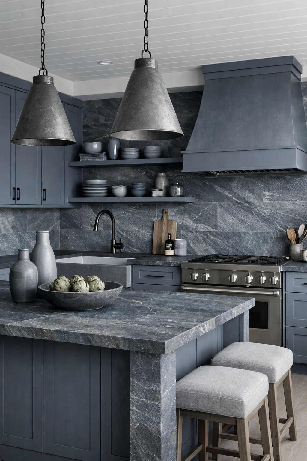 Monochromatic designs are a major trend for 2026, and the use of slate blue and natural slate is a perfect example of this approach. By using similar tones for both the cabinetry and the stone surfaces, designers create a sense of unity and calm.
