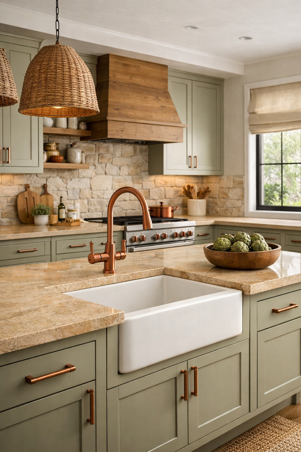 Pale olive is a soft, nature-inspired color that brings a sense of tranquility to the kitchen. When paired with the warm, grainy texture of natural sandstone, the result is a space that feels deeply connected to the earth.