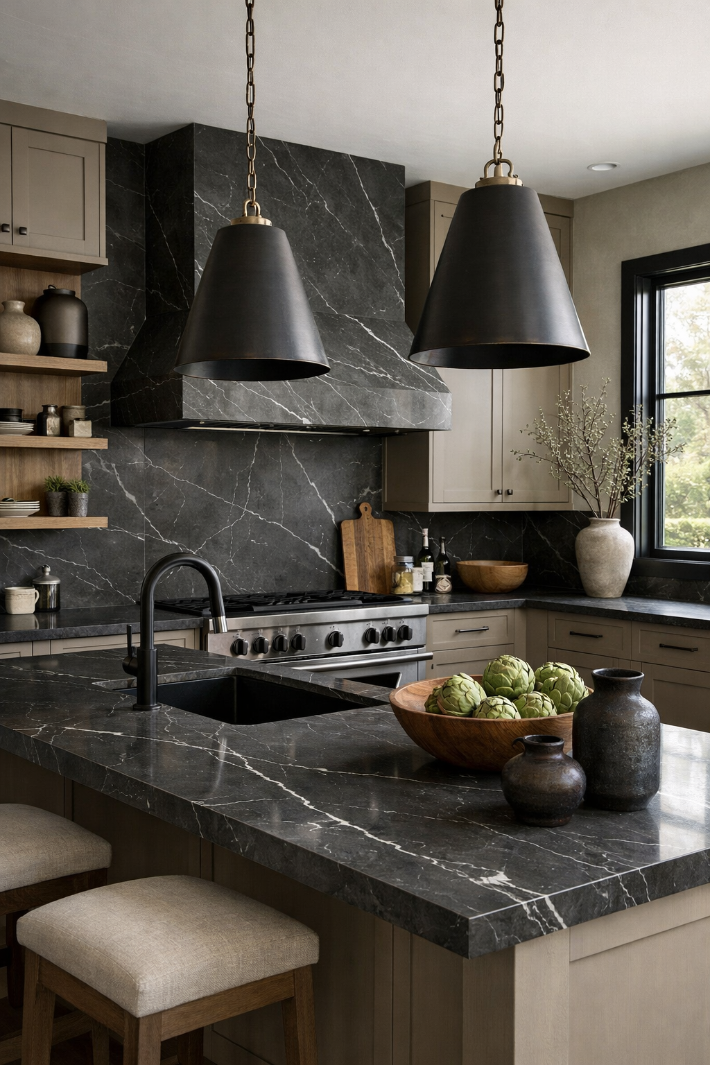 The dark, dramatic marble provides a sharp contrast to the soft greige cabinetry, creating a sense of visual tension and interest. This combination is perfect for those who want a neutral palette with a bit of a bite.