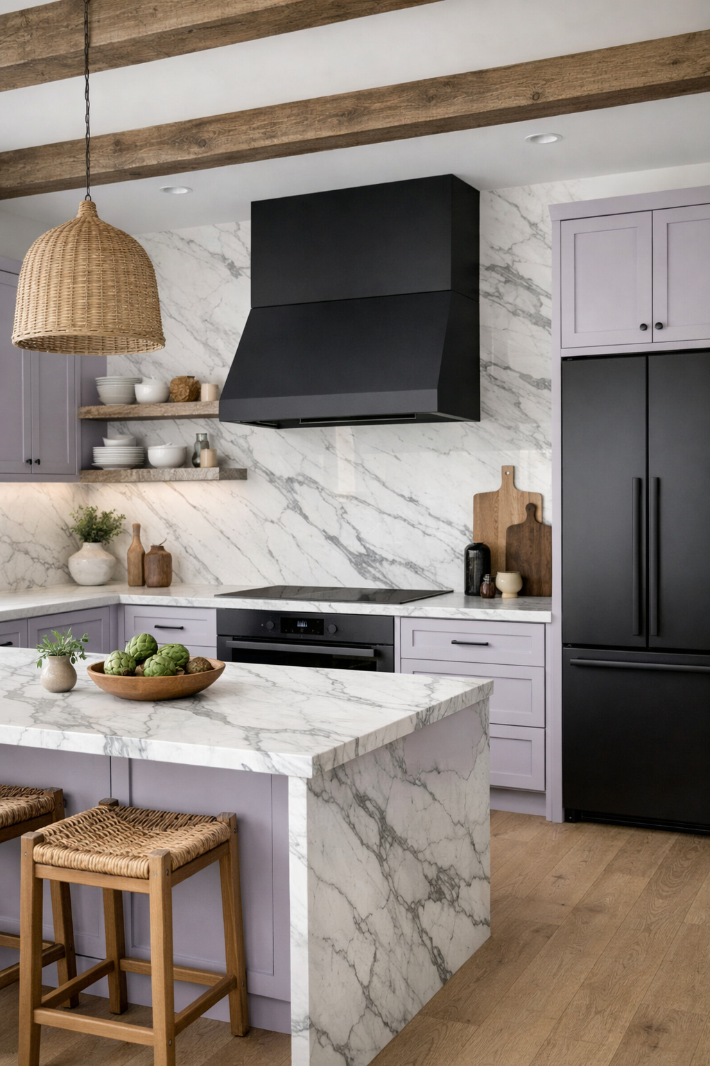 To ground this ethereal palette, designers are pairing it with high-contrast Calacatta marble. The bold, grey veining of the stone cuts through the softness of the lavender cabinetry, providing a necessary sense of weight and permanence.