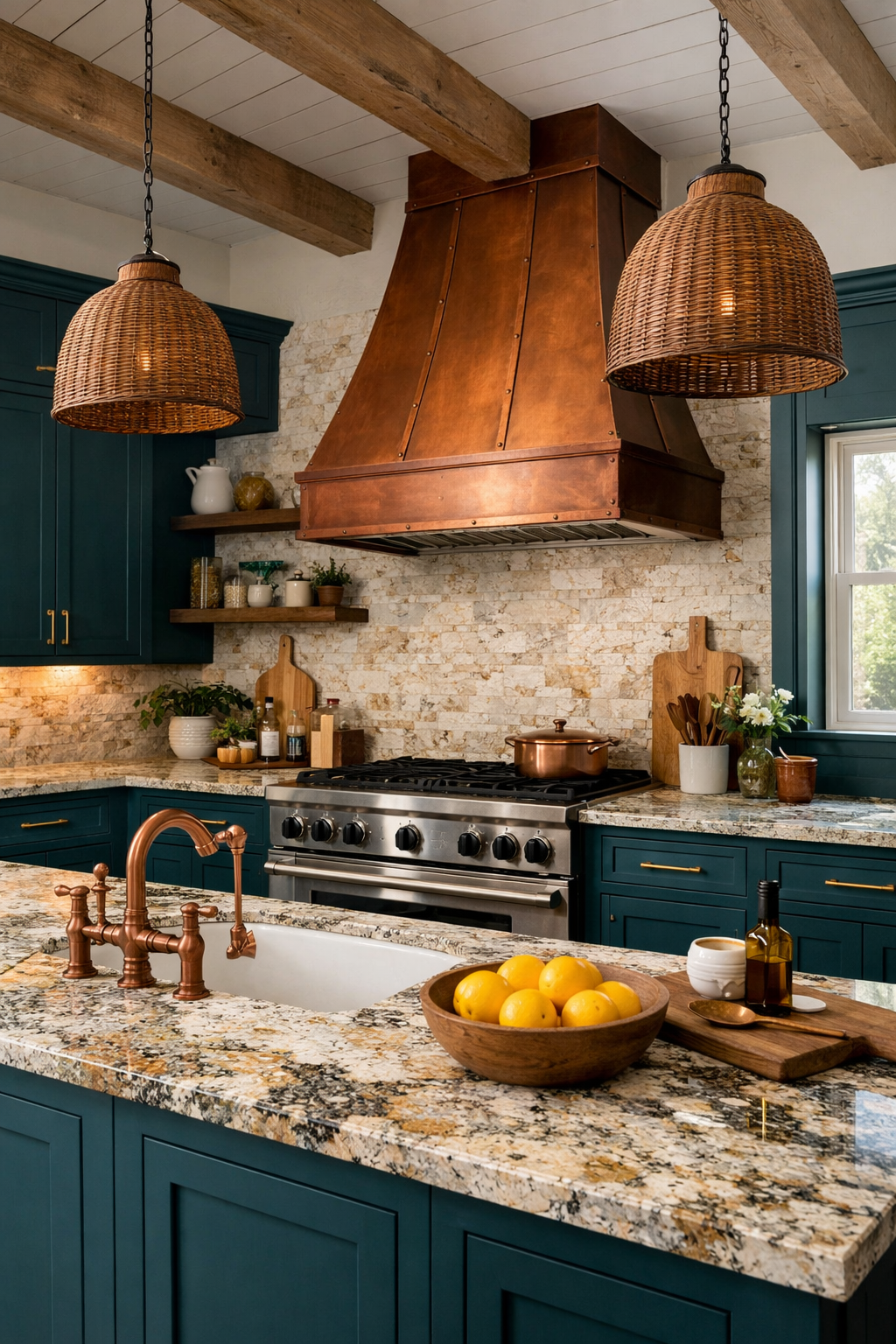 The warm glow of the copper complements the cool tones of the teal, while the speckled granite provides a complex and interesting surface that ties the whole look together. This design is all about the joy of color and the beauty of natural materials.