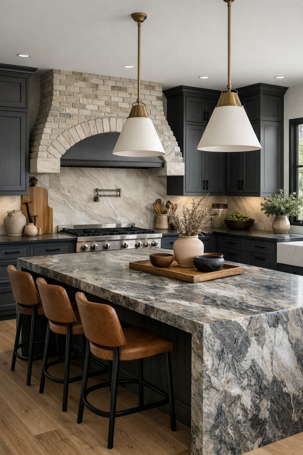 An arched brick range hood introduces a traditional farmhouse element, but its clean execution keeps it modern. The raw texture of the brick complements the ruggedness of the quartzite, creating a harmonious balance of industrial and rustic influences.