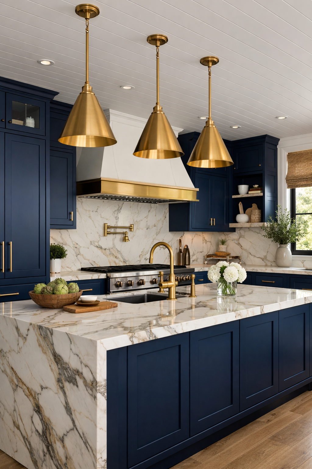 Navy blue remains a staple of the modern farmhouse, but in 2026, it is being reimagined with a focus on luxury and light. Crisp navy cabinetry provides a deep, saturated backdrop for the luminous beauty of Calacatta Gold marble.