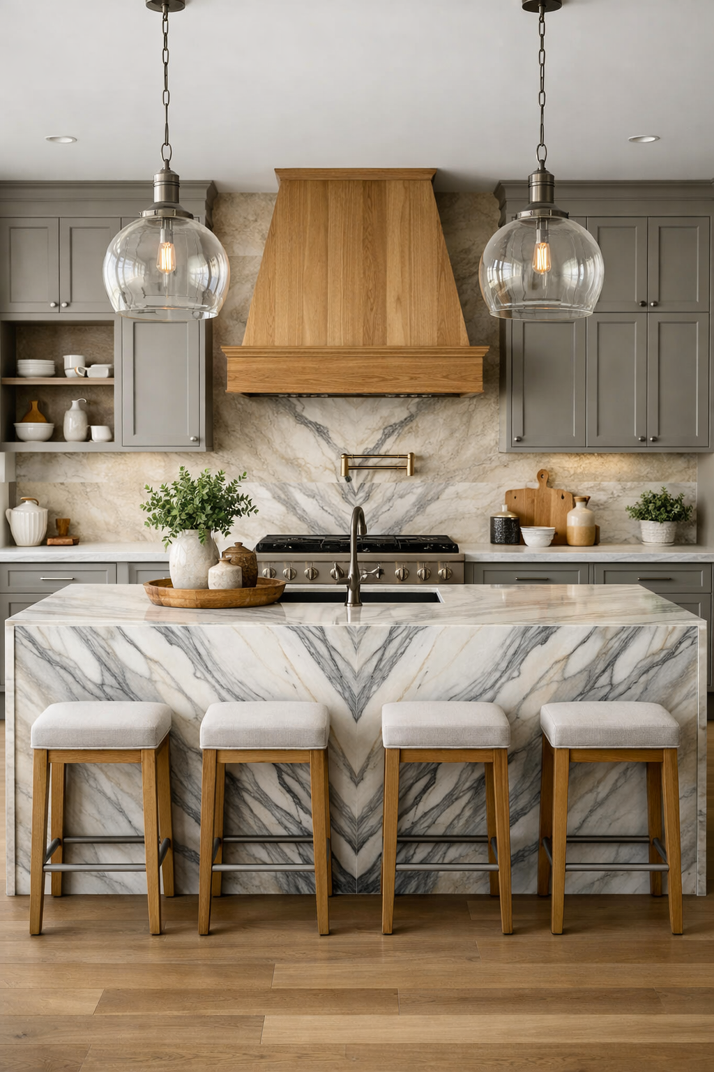 Warm grey cabinetry provides a sophisticated and neutral frame for the dramatic marble island. A custom oak range hood adds a touch of natural warmth, bridging the gap between the cool stone and the painted wood.