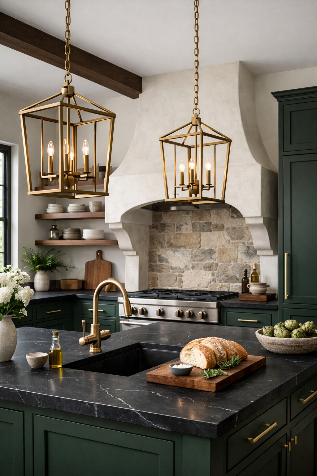 Soapstone naturally darkens over time, developing a rich patina that perfectly complements the forest green cabinetry. Brass cage pendants add an industrial touch, while an antique white plaster hood provides a soft, sculptural element that breaks up the dark tones.