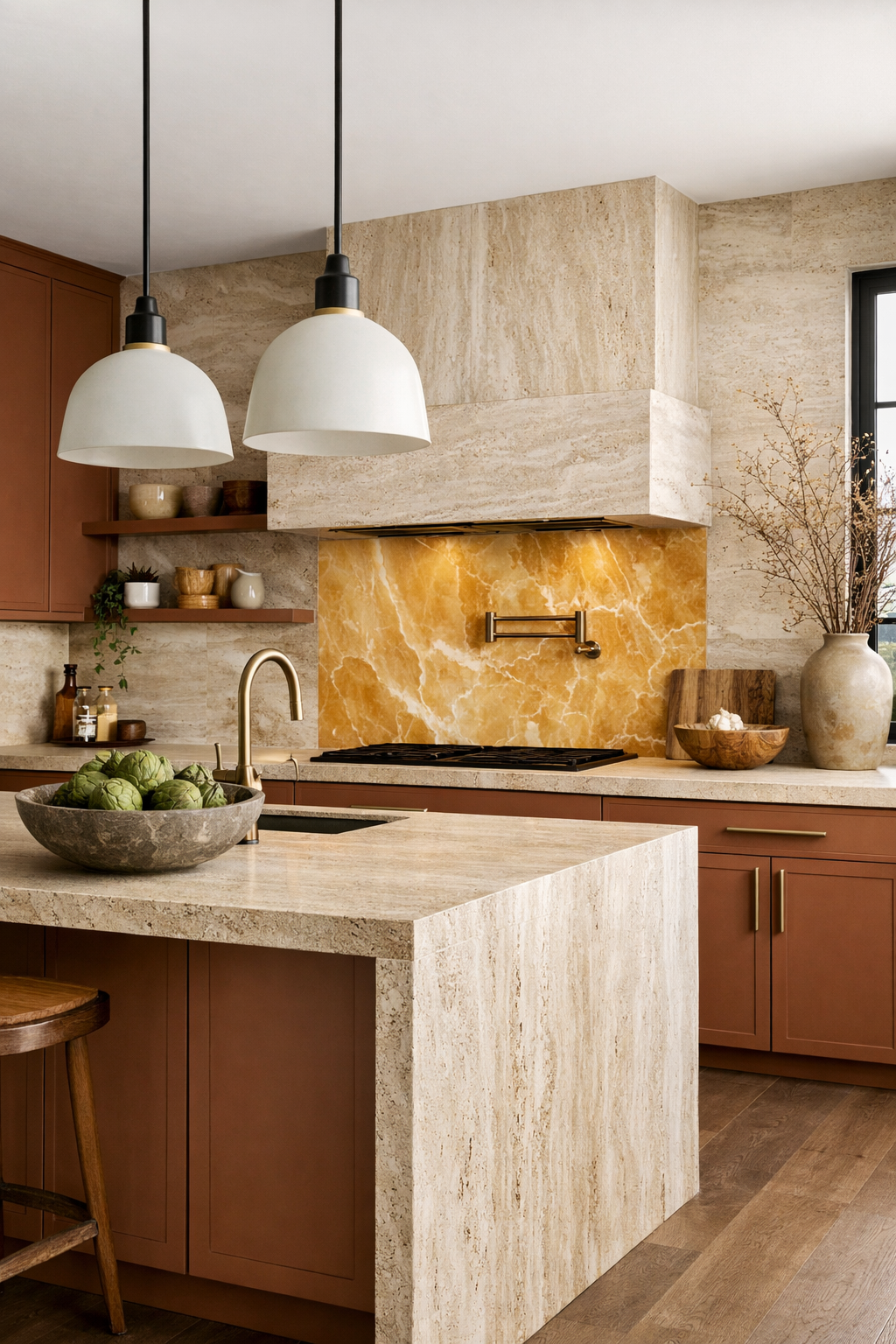 Earthy, sun-baked colors are a major trend for 2026, reflecting a desire for warmth and connection to the land. Terracotta-toned cabinetry brings a vibrant yet grounded energy to the kitchen, especially when paired with the unique texture of travertine.