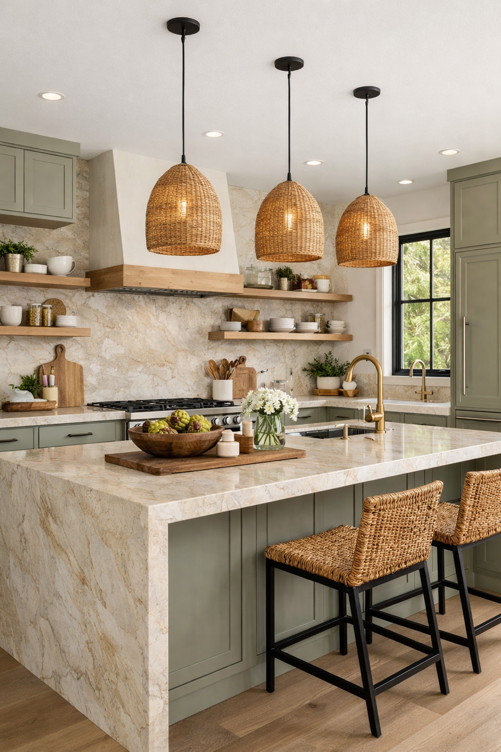 The soft, creamy tones of the quartzite pair beautifully with the gentle green of the cabinetry. Natural wood open shelving adds a touch of rustic charm, while keeping the overall look clean and uncluttered.
